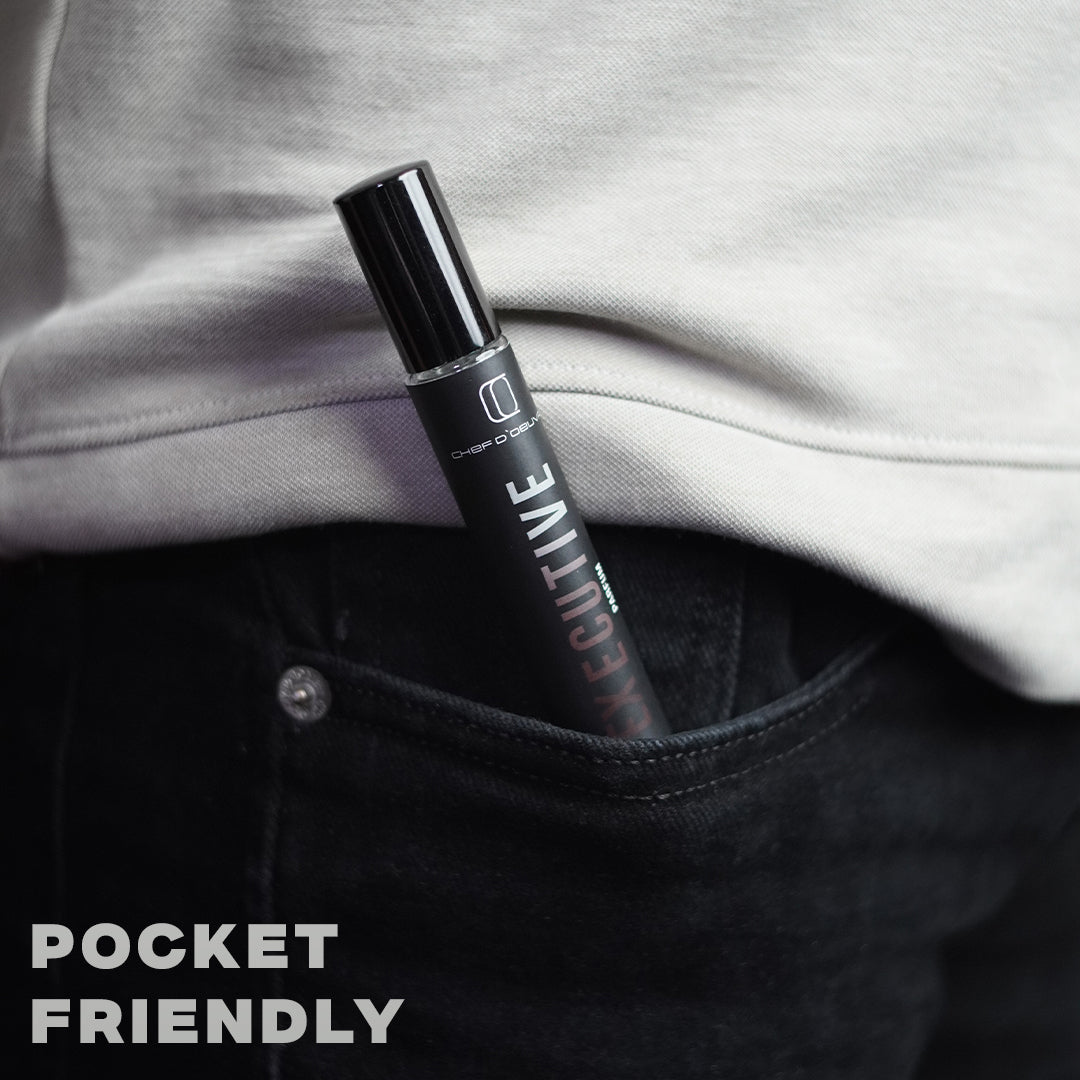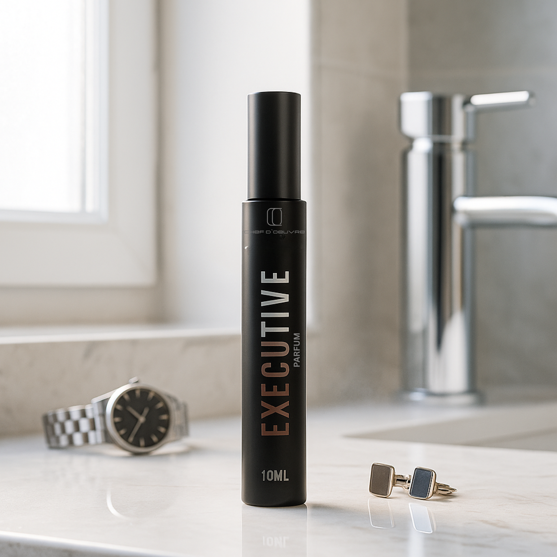 Executive greets you with grapefruit, lemon-mint, bergamot, and pink pepper. A spicy heart of ginger and nutmeg blends with an amber-cedar base, invoking timeless sophistication.
