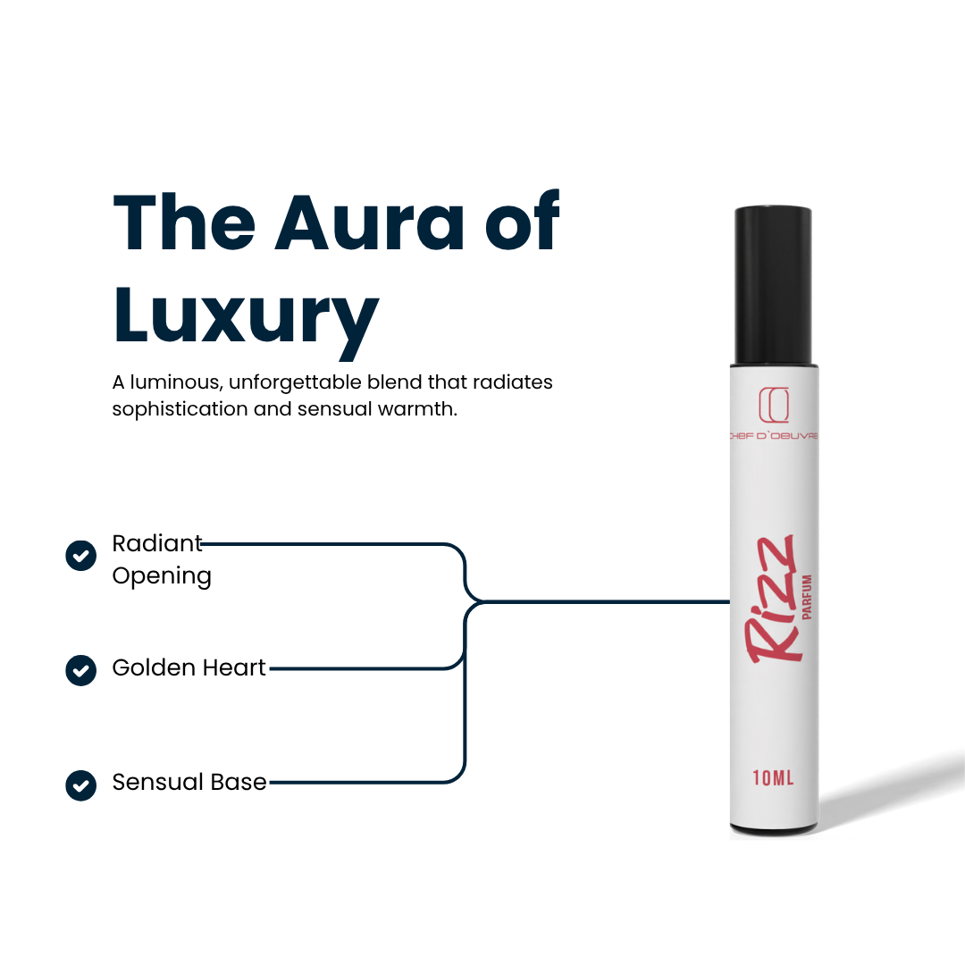 Rizz opens with saffron and jasmine, unfolding into amberwood and ambergris, with a deep foundation of fir resin, cedar, sugar, oakmoss, and ambroxan—sensual and long-lasting.